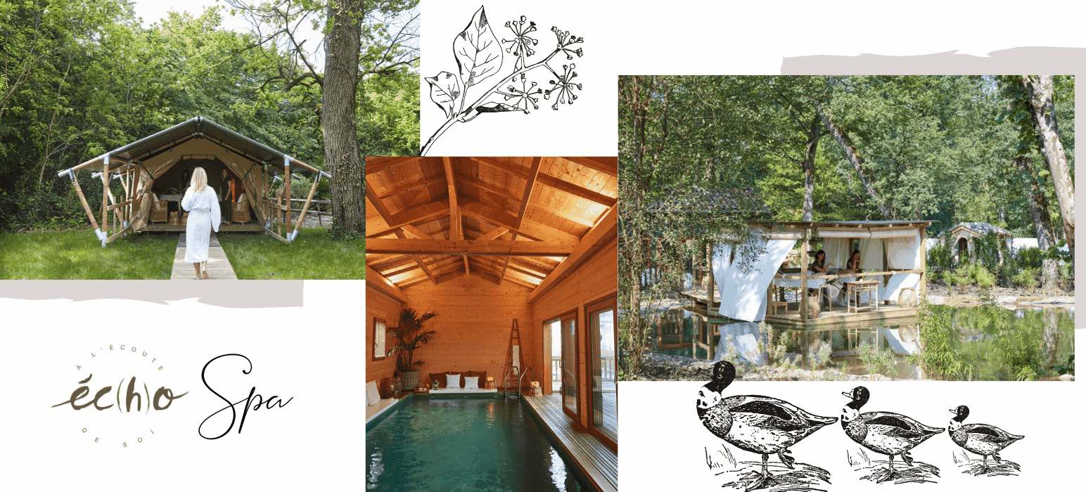 Discover our private éc(h)o spa in the heart of the park, next to a little lake where the sound of the ducks swimming and the song of the birds will transport you away …